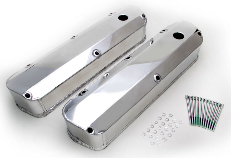 These Polished Hamburger's fabricated aluminum valve covers are for use on 1962-85 SB Ford (289-351W) engines. They are super strong, yet very lightweight. They are precision manufactured using 1/4" rails to provide a positive seal and eliminate oil leakage between the valve cover and head. This pair has one baffled breather hole per cover for use with breathers, caps or PCV valve (sold separately). They measure 3-3/4" tall and have a great looking polished aluminum finish that is easy to maintain. This set includes mounting hardware, but gaskets are sold separately.