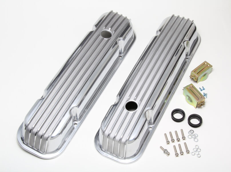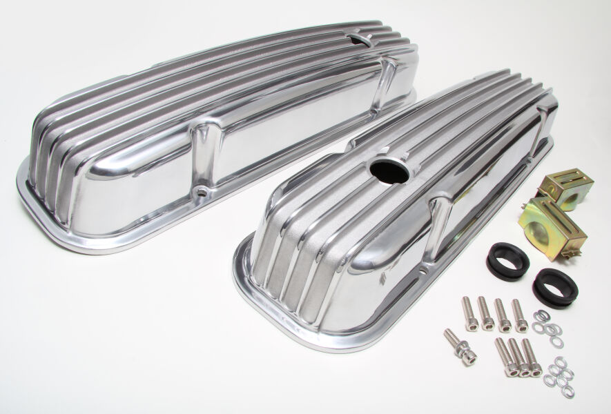 One pair of aluminum valve covers, bolt-in baffles, and mounting hardware. Gaskets not included.