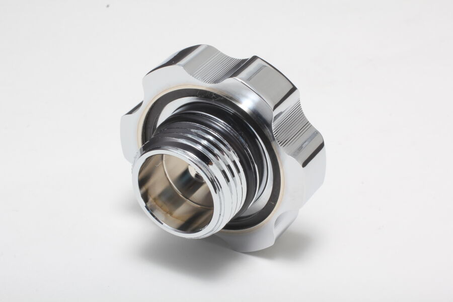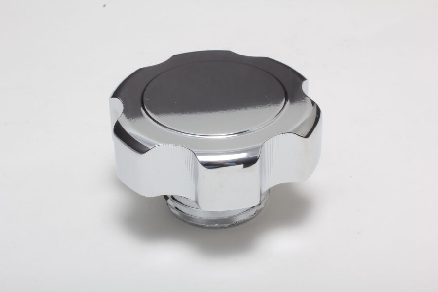 This polished aluminum oil cap threads into factory valve covers on 1987 and later GM cars and trucks. The cap has also been chrome finished for a low maintenance finish.